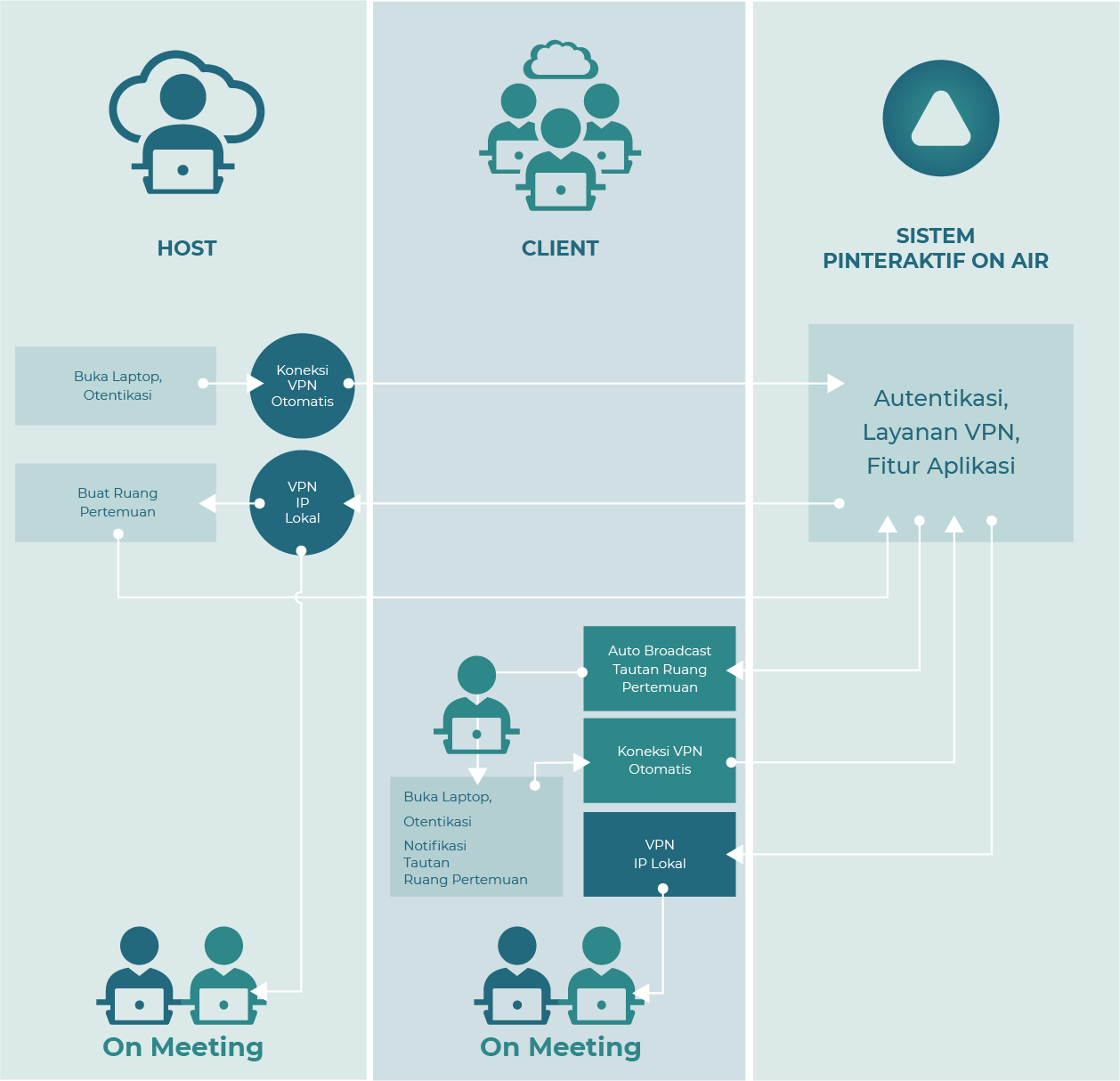 Jadikan ruang rapat anda terhubung secara virtual dengan ruang rapat lain dengan sekejap. On Air Conference tersedia dalam bentuk perangkat keras dan perangkat lunak yang implementasinya bisa diintegrasikan dengan perangkat lain yang ada.